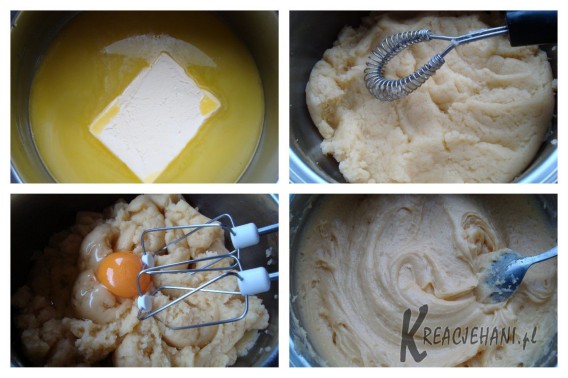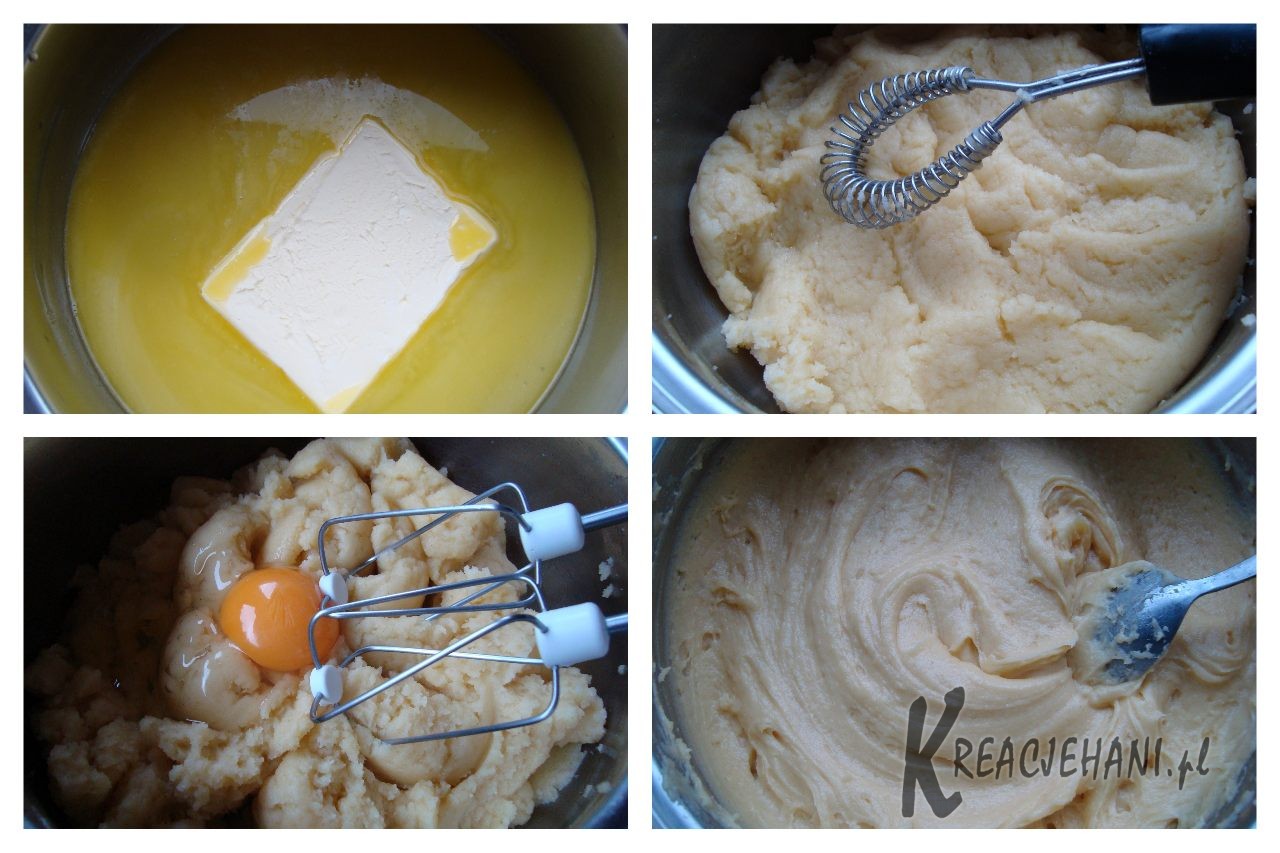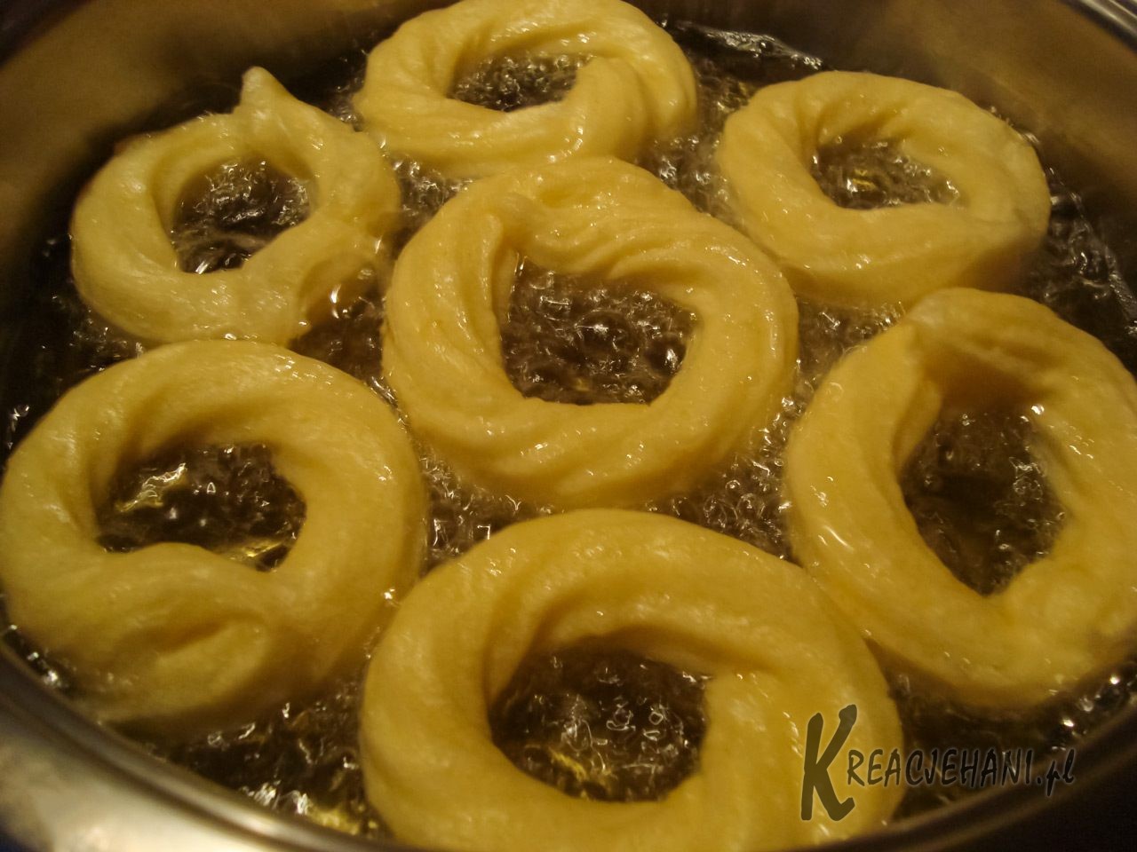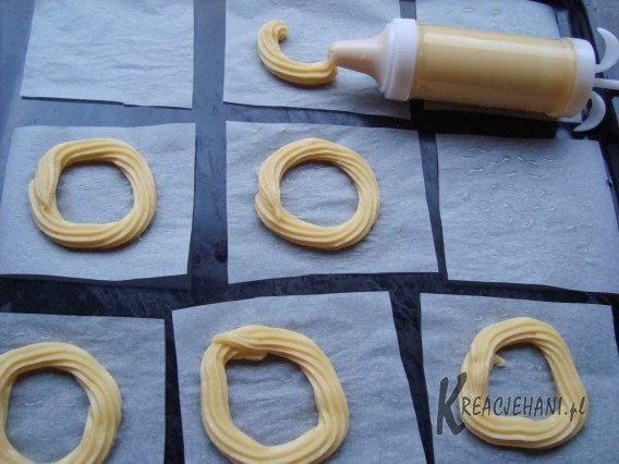 W garnku zagotować szklankę wody z tłuszczem i szczyptą soli. Do wrzątku wsypać mąkę i energicznie mieszać, aż powstanie jednolita masa. Zdjąć z ognia i pozostawić do wystudzenia. Do zimnego ciasta wbijać jajka, jedno po drugim i zmiksować na gładką masę. Nałożyć ciasto do szprycy cukierniczej i na pocięty w kwadraty i natłuszczony olejem papier do pieczenia wyciskać okręgi. W ten sposób przygotować porcje, aby smażenie ciastek przebiegało sprawnie.