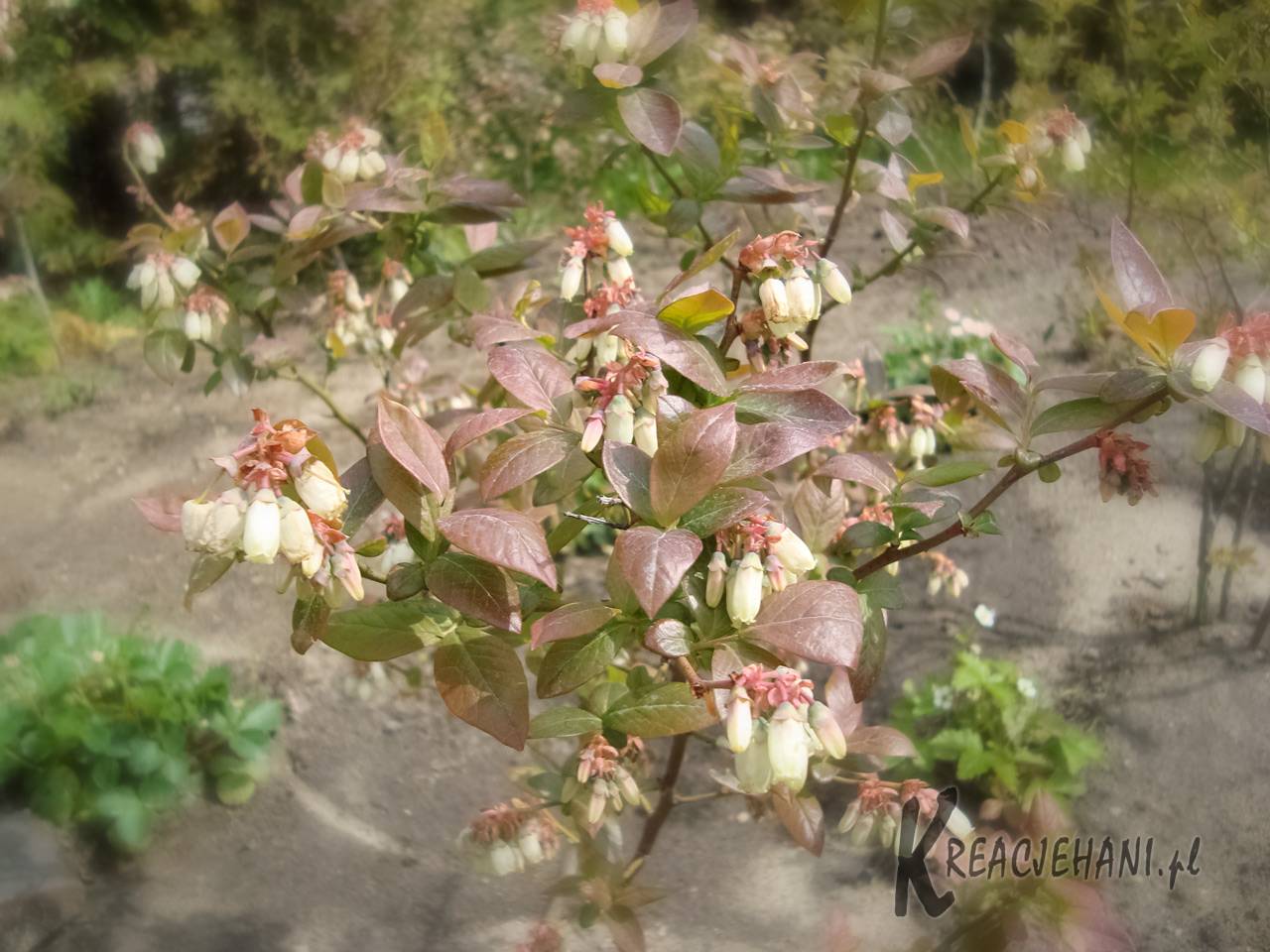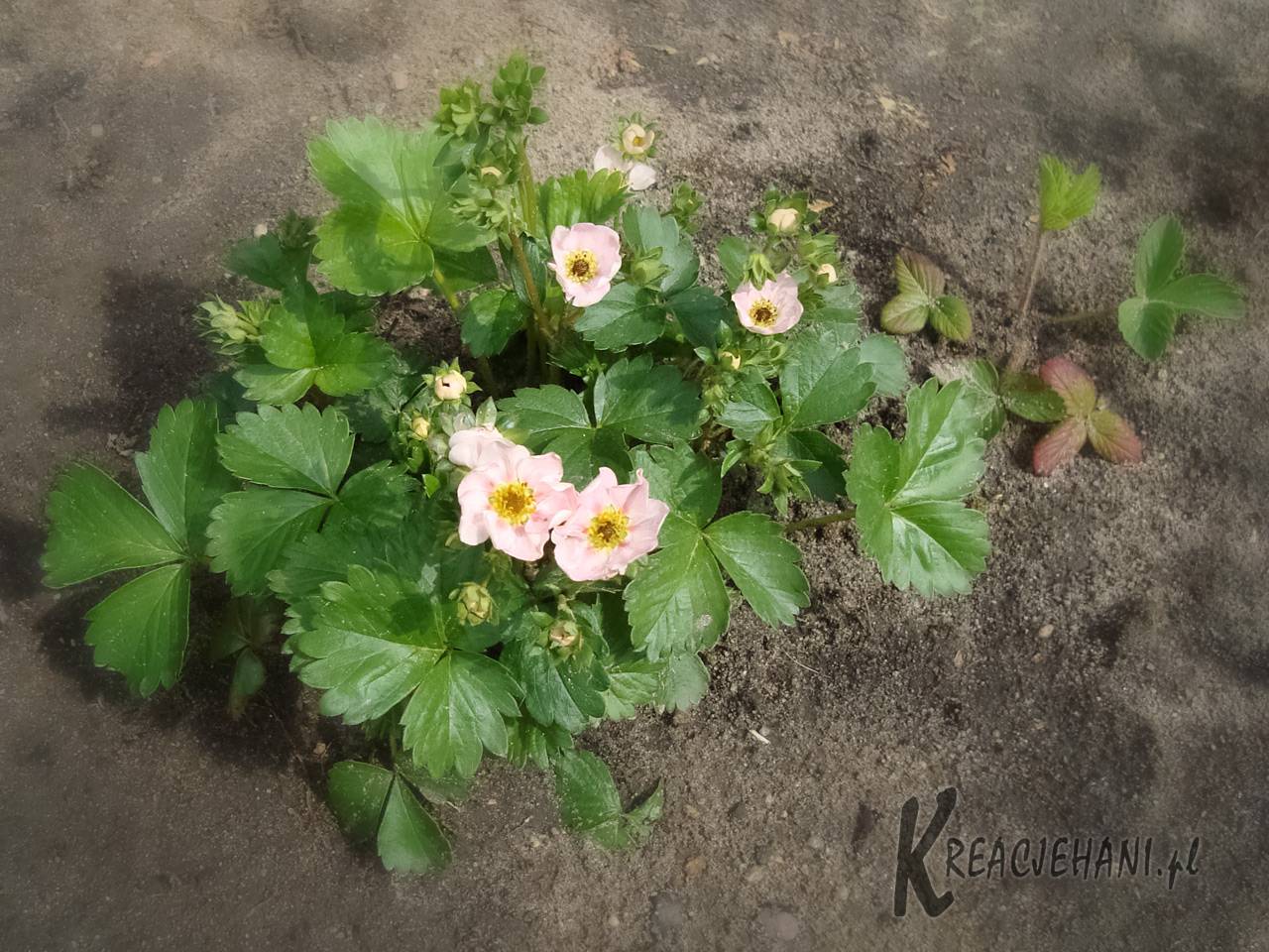 Na zdjęciu powyżej kwitnący krzak borówki amerykańskiej, a poniżej truskawki.