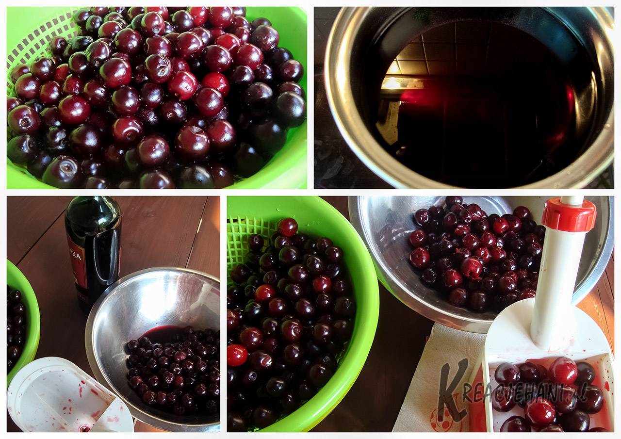 Wiśnie umyć, odsączyć i wypestkować. Wydrylowane wiśnie pozostawić na sicie do odcieknięcia soku. Galaretkę zalać gorącym winem i wymieszać do jej całkowitego rozpuszczenia.