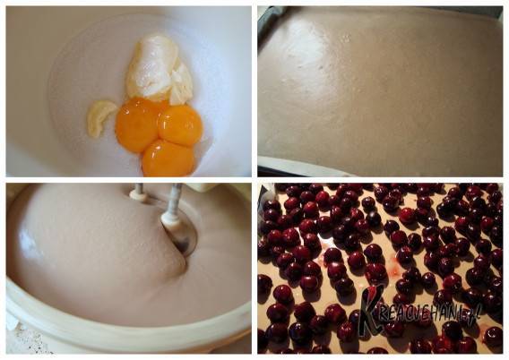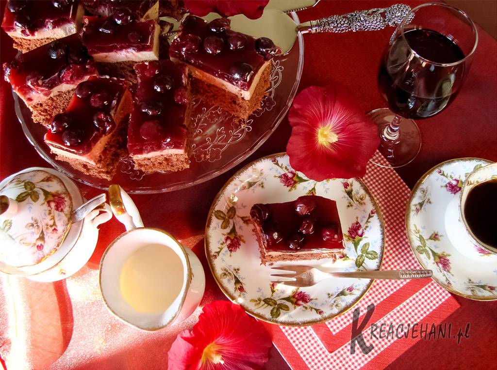 Do masy sernikowej dodać 3-4 łyżki kakao, dobrze zmiksować. Gotową masę serową nałożyć na upieczony i wystudzony biszkopt. Włożyć ciasto do lodówki, dla dobrego stężenia masy. Na sztywną masę nałożyć wypestkowane wiśnie i zalać je rozpuszczoną w winie galaretką.