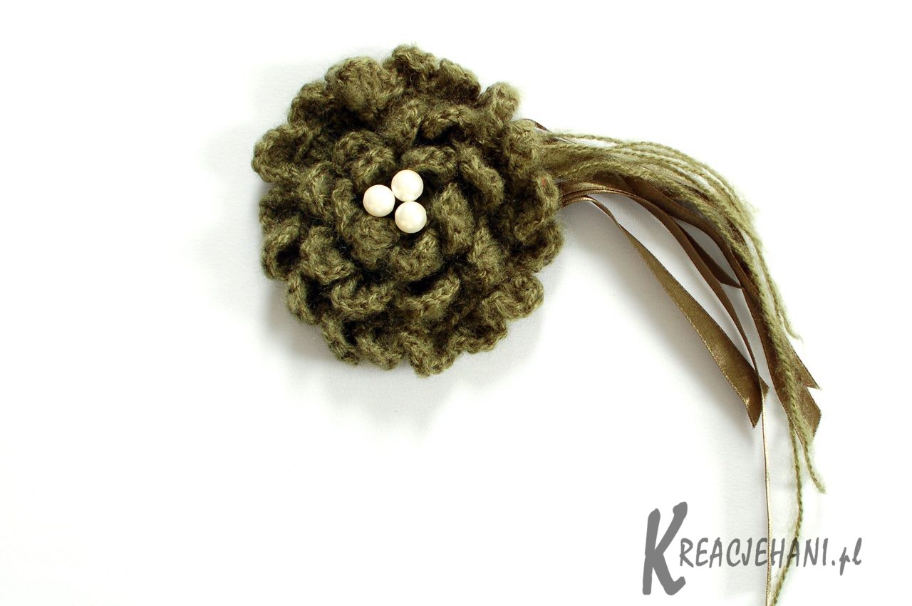 Broszka – kwiat, wykonana na szydełku, którą można przypiąć zarówno do szala, jak i do swetra.