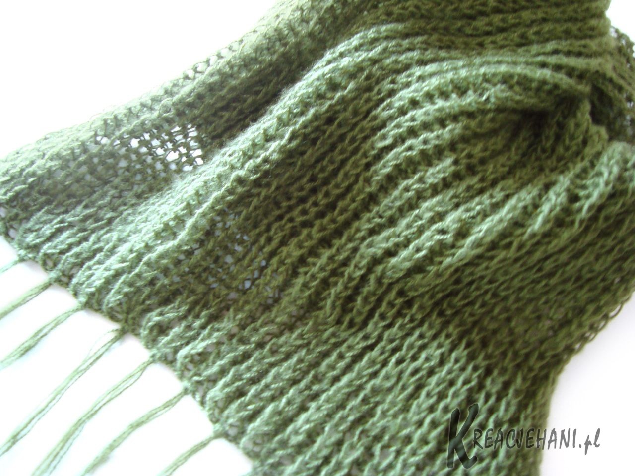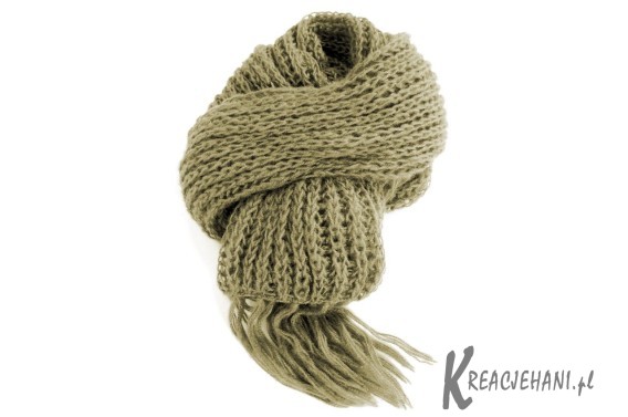 Jeszcze jeden szal, z przyjemnej w dotyku włóczki, w kolorze oliwkowym, również wykonany na grubych drutach, ściegiem patentowym.