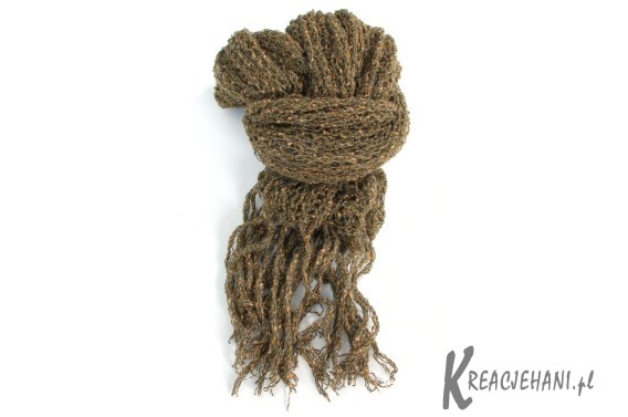 Szal z cienkiej bukle, udziergany ściegiem patentowym, w kolorze khaki, z dekoracyjnymi bardzo długimi frędzlami.