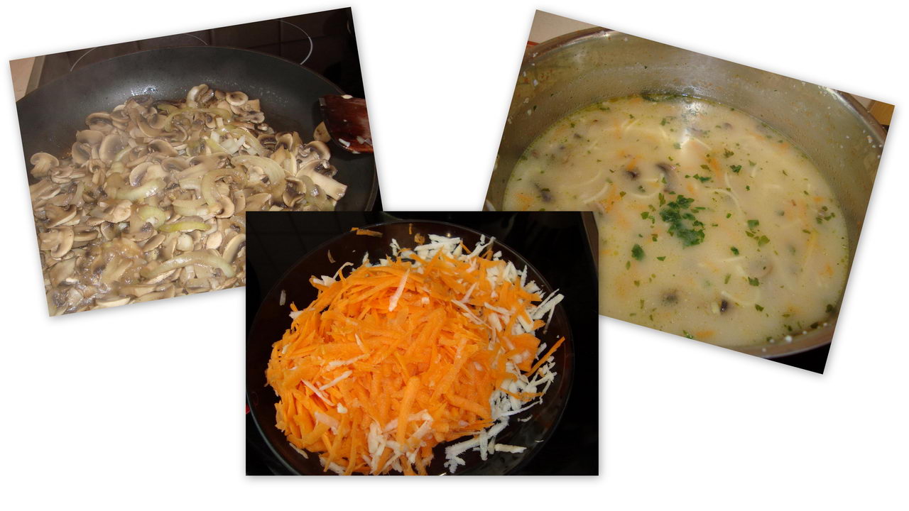 – do zupy dodać: 2 łyżki kaszy mannej i podsmażone pieczarki,